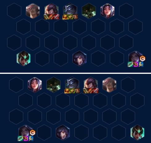 〖Two〗、阶段:3-2阶段拉6人口,若有虚空纹章,直接激活6虚空,这是质变。否则补充雷克顿增加坦度。4-1阶段拉人口,补充卡莎和亚索,激活2决斗羁绊,直接跳8人口。8人口时找到卑尔维斯,激活8虚空羁绊,后追2星亚索+卡莎完成阵容。大后期可考虑拉9人口补充2星5费卡提升阵容稳定性。