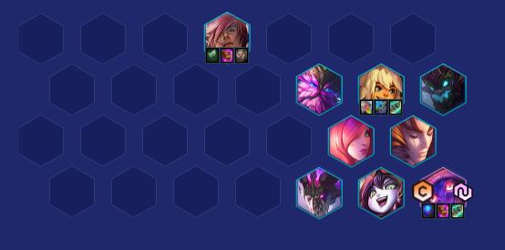 〖Five〗、阵容由虚空恐惧、齐天大圣、皮城执法官、暴走萝莉、蒸汽机器人、虚空遁地兽、南天之怒、双枪女帝组成,8人口即可形成稳定阵容。核心在于暴走萝莉作为主C,6斗士提供额外生命值(900点),虚空单位随时间增长提供真实伤害,每4秒叠加10%,比较高5层。