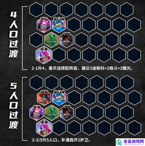 过渡与成型:新版本天选改动后,1/2费卡较容易追到3星,其他费用的卡很难追3星。因此,迪斯科卡牌阵容过渡简单,中期压力小,8人口找天选锁血,尽量是卡牌天选能直接两星,上9人口找各种五费两星提升上限。