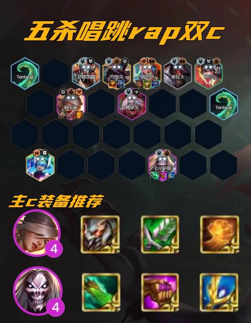 金铲铲之战唱跳双C阵容搭配攻略 关键英雄选取:c位1:选取具备强力唱跳输出技能的英雄,如能对多个敌人造成范围魔法伤害且附带特殊效果的角色。装备上重点考虑法术强度、法术暴击和蓝量相关,如大天使之杖加快技能释放,帽子提升法术强度,法爆增加暴击伤害。