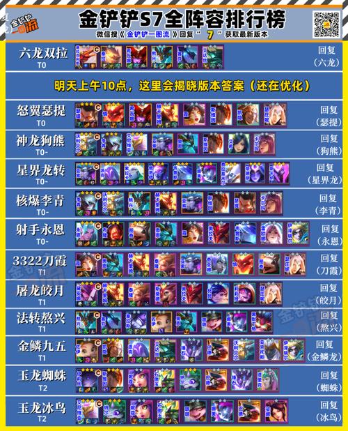 阵容组成 核心成员:加里奥、瑟庄妮、瑟提、努努、沃利贝尔、艾翁、婕拉、黑默丁格、艾希。成型人口:8人口成型,构成4斗士5龙族的强力组合。羁绊搭配 主要羁绊:5龙族:提供额外的金币和装备掉落,有助于快速提升经济和装备水平。4斗士:增加斗士们的生命值和攻击力,使阵容更加肉厚且输出不俗。