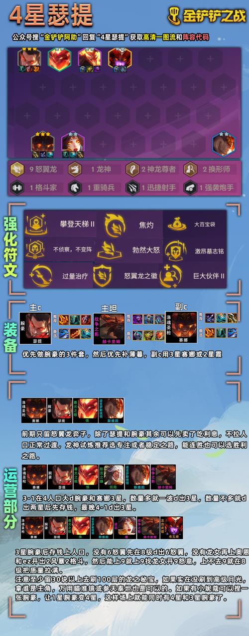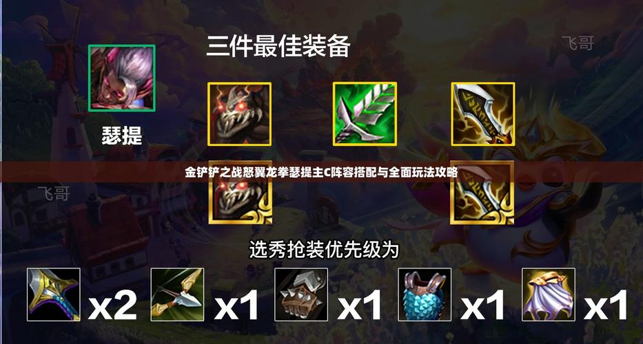 前期尽量嫖到2-3张瑟提,如果数量不足,可以考虑其他过渡阵容。连败拿装备,优先合成瑟提所需的法强和回蓝装备。中期过渡:3-1阶段大D三星瑟提,这是阵容的关键节点。D出三星瑟提后,直接升6人口,补充其他怒翼龙英雄,形成初步的怒翼龙羁绊。