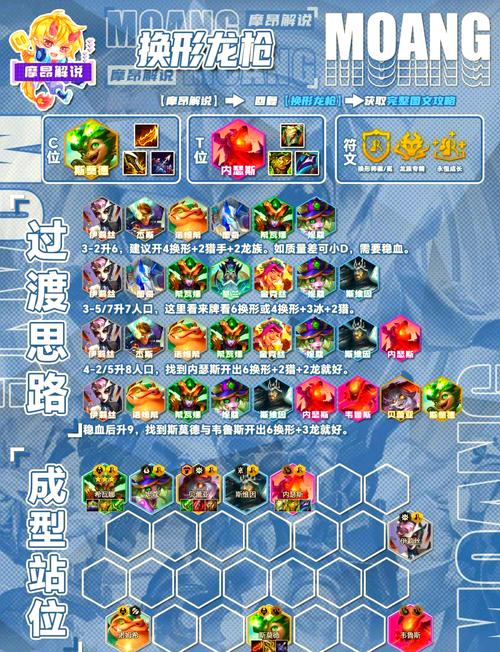 《金铲铲之战》S12换形龙枪玩法介绍:阵容组成 核心英雄:蜘蛛、贝蕾亚(小火龙)、乌鸦、狗头、妮蔻、龙女、斯莫德。辅助英雄:诺姆希(小龙)、韦鲁斯。羁绊搭配 主要羁绊:6换形师,提供强大的前排坦度和变身后的爆发伤害。次要羁绊:3龙族,增加全队属性,同时龙族英雄也有不错的输出能力。