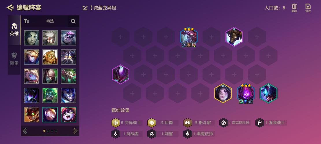 〖One〗、在《金铲铲之战》中,变异巨像卡莎阵容的搭配指南如下:核心英雄与装备 卡莎:作为主C英雄,卡莎的技能能够在战斗中对敌人造成高额伤害。为了确保她的输出能力,推荐为其配备无尽之刃(大幅提升暴击伤害)、巨人杀手(针对敌方前排造成额外伤害)以及饮血剑(提供生存保障和吸血能力)。