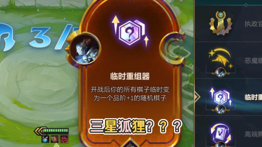 在金铲铲之战中,赌变形重组器的方法主要基于其出现规律:观察海克斯出现顺序:规律一:如果第一海克斯是金符文,第二海克斯是英雄强化,那么第三海克斯必定是银色海克斯,此时就有概率出现变形重组器。