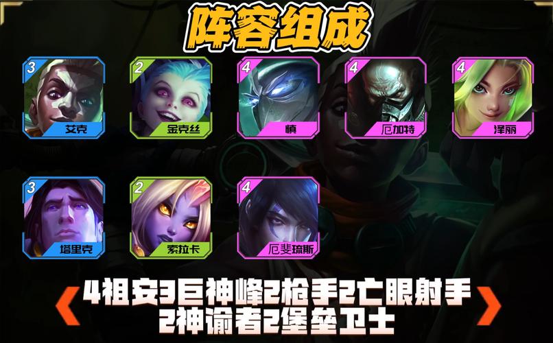〖Three〗、利用利息追三星狼人金克丝,这是阵容成型的关键。后期成型:金克丝狼人三星后,升7人口找越南(这里可能是指寻找更多关键英雄以完善阵容),开出4枪手4祖安2潜行2主宰羁绊。5-1升8人口,搜出希尔科组成完整祖安羁绊。无需升9人口,最终阵容大成。