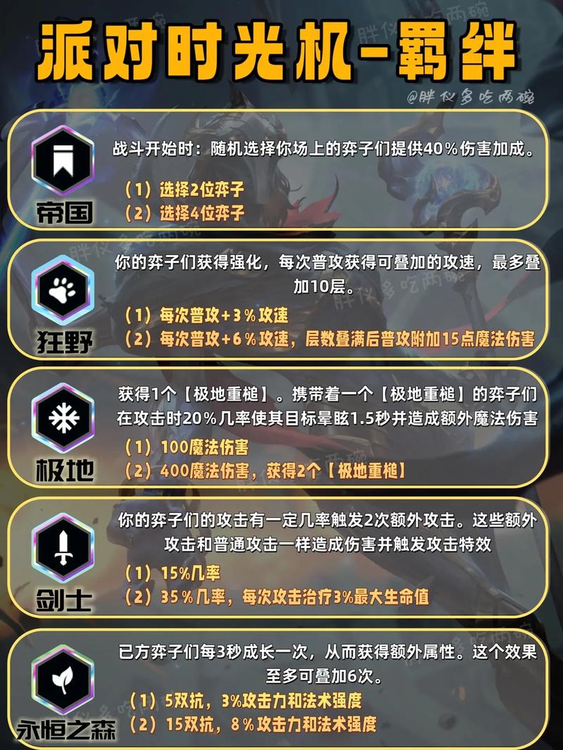 〖One〗、作用:让弈子在战斗中发挥更重要的作用,提升整体战斗力。总结:在金铲铲之战派对时光机模式中,选取羁绊时需要根据自己的游戏风格和当前局势进行权衡。金鳞龙适合稳健发育的玩家,8比特适合追求高爆发的玩家,约德尔人则适合喜欢追求三星弈子的玩家,而社交名流则能为弈子提供全面的属性提升。