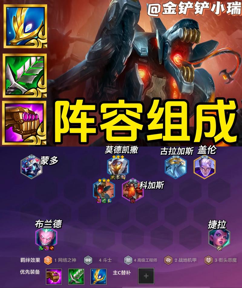 人口开3德玛西亚+3诺克+4裁决羁绊,只上一只铁男就行。这时候装备基本只够皇子和铁男两个人。第三个海克斯只推荐拿战力,理由前文有提及。2星铁男上8,8人口直接梭哈,找另一只2星铁男出来,阵容大成。第二只铁男没来可用沙皇带装备打工。如果有裁决转,上1只铁男即可,补挖掘机/剑魔开6裁决。
