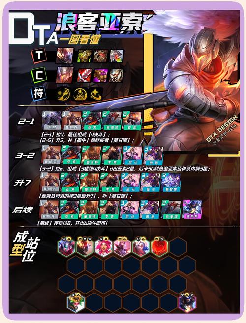 〖One〗、关键角色与装备 迭嘉:核心输出角色,需携带羊刀与科技枪来提升输出能力和生存能力。法剑系装备推荐大天使,而火炮可作为法剑系的备选装备。 金龙:装备选取御金师、大宝石、投机者等,以增强阵容的整体实力和续航能力。