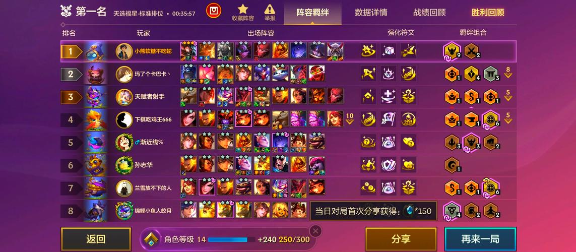 〖Four〗、阵容搭配:孙悟空、内瑟斯、贾克斯、艾瑞莉娅、凯尔、李青、霞,八人口可上永恩或慎。核心思路:利用天神羁绊的飞升效果,获得伤害减免并额外造成真实伤害。主C凯尔推荐装备为火炮、夜之锋刃、珠光护手,若无需切后排可将夜之锋刃换成科技枪。优势:后期强势,伤害减免和真实伤害效果显著。