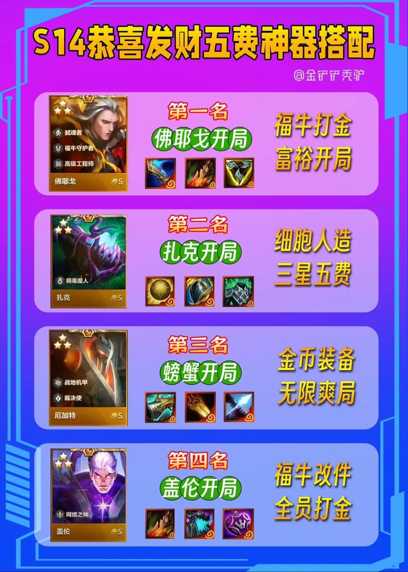 〖Two〗、金铲铲之战s14恭喜发财佛耶戈开局玩法如下:前期运营 装备选取:游戏开始,优先拿取大剑和拳套。大剑用于合成饮血剑,提升佛耶戈的续航能力;拳套则用于合成正义之手,增强佛耶戈的输出能力。打工阵容:尽量用2-3费卡如凯隐、寡妇等组成刺客羁绊进行打工,保证前期过渡平滑,血量健康,为后续阵容成型做准备。