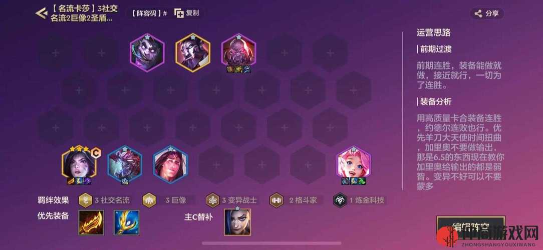 九尾妖狐阿狸:作为输出主力,必备。她的技能伤害极高,能在战斗中对敌人造成大量魔法伤害。棋子选取 蛇女:强力的法师辅助,能补充输出和控制。风女:秘术师的关键棋子,提供魔抗加成和群体击飞控制。宝石:不仅是秘术师,还能给队友提供护盾和回血。