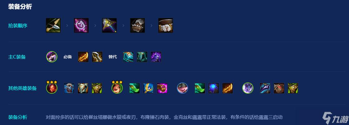 〖Three〗、金克丝(主C):必备朔极之矛、无尽之刃;备选巨人杀手、正义之手。雷恩加尔(副C):饮血剑+正义之手;泰坦的坚决也可考虑。妮蔻(主坦):石像鬼石板甲+狂徒铠甲;可补救赎或龙牙以强化坦度。