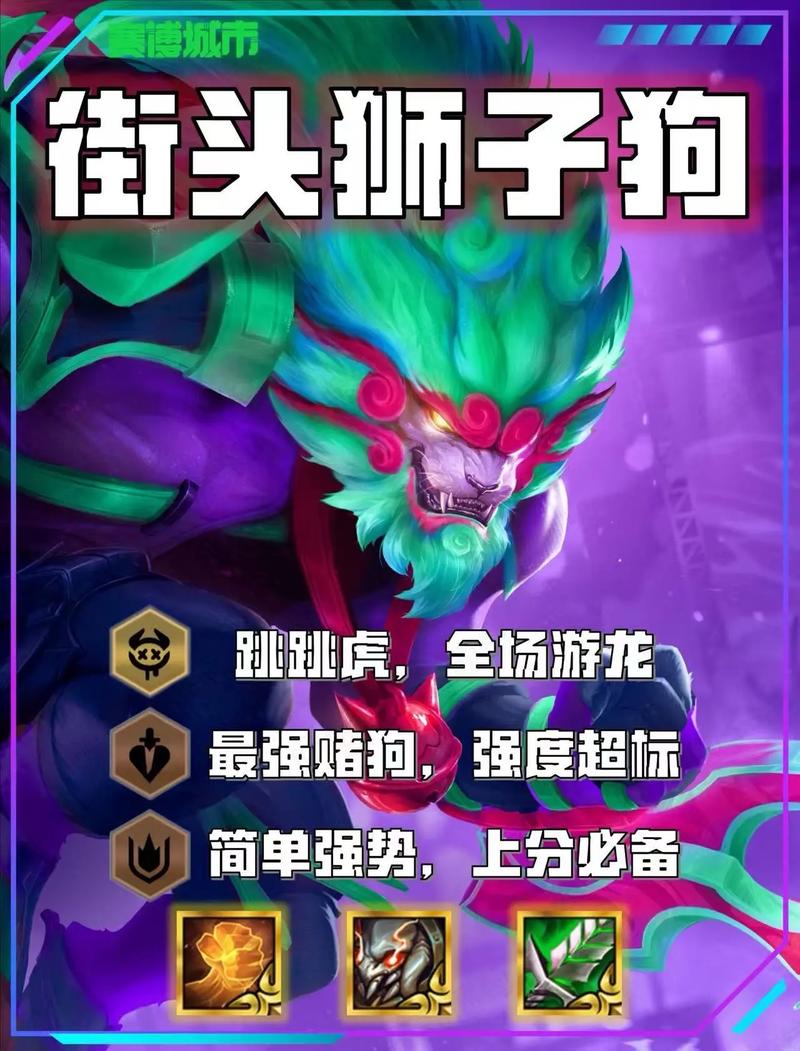 〖One〗、金铲铲之战S14街头金丝狗阵容搭配攻略如下:阵容构成 核心英雄:金克丝、雷恩加尔(狮子狗)、妮蔻、薇古丝、古拉加斯、艾克、蒙多医生。羁绊组合:5街头恶魔、2裁决使、2斗士。强化推荐 优选:便携锻炉、三项赛I、操纵商店。次选:活体锻炉、英勇福袋、不是今天、大剑溢流、潘朵拉的备战席。