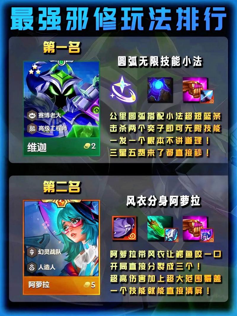 〖Two〗、泽丽:主C,优先装备鬼书、电刀、水银。金克丝:副C,收集多余装备。日女:需肉装,如龙牙、反甲、石像鬼等。烬:可装备工具装。海克斯科技选取 优先选取保镖类海克斯,若无,可选取经济或战力提升类海克斯。前期过渡阵容 3约2保镖2极客:波比、炸弹人、库奇、诺手、机器,上6时可补充卢锡安。