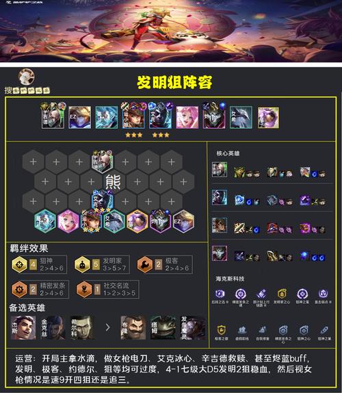阵容组成与羁绊分析 阵容组成:凯特琳、瑟庄妮、艾希、厄运小姐、蔚、烬、杰斯、奥莉安娜。搭配4狙神、5执法官、2精密发条、2格斗家羁绊(需要执法官之心或纹章)。若有狙神纹章,可将奥莉安娜替换为泽丽,组成6狙神羁绊。