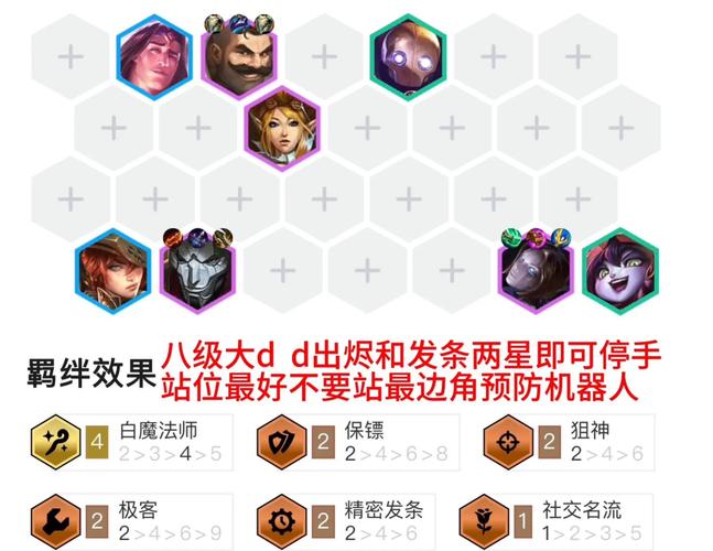 〖Five〗、云顶之弈白魔保镖狙神阵容搭配为机器人、宝石、女枪、布隆、烬、发条、风女、猫。这套阵容的羁绊体系为3白魔、2精密、2保镖、2极客、2狙神、2学者、1猫猫、1名流。装备推荐如下: 烬:优选轻语、巨杀/无尽,备选水银/飓风。