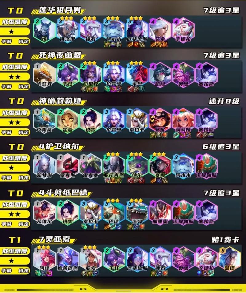 T0级上分阵容半神狗熊(神龙尊者体系)核心组成:狗熊(主C)+奥恩+冰鸟+盲僧+卡尔玛+亚索 关键羁绊:6神龙尊者+3传奇半神 装备优先级:狗熊必备羊刀、水银、饮血剑;盲僧带肉装抗伤。运营思路:3-7阶段D出2星狗熊稳血,4-5上8追三星,冰女和盲僧的减抗效果可替代离子火花。测试中能击败三星四费卡,强度极高。