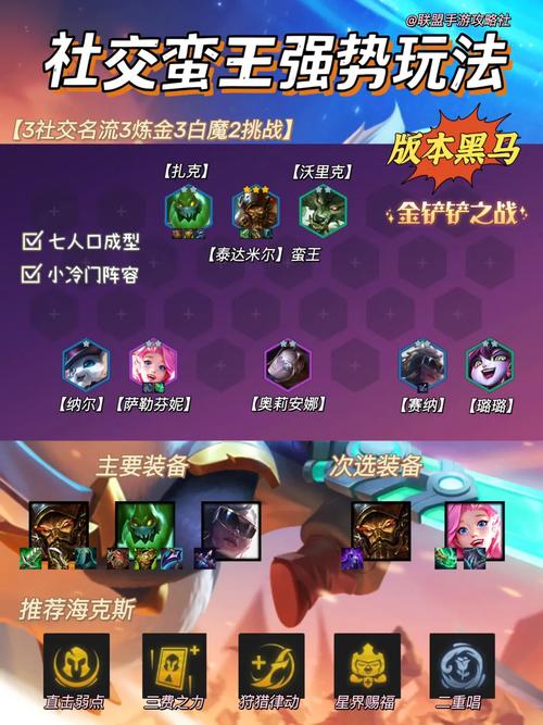 金铲铲之战高效上分攻略:炼金蛮王阵容搭配与策略深度解析 阵容核心组成 核心英雄:泰达米尔(蛮王)、沃里克(狼人)、扎克等。羁绊搭配:追求5炼金科技、2格斗家、2挑战者、2学者等,根据来牌和海克斯强化灵活调整,以提供强大的输出和生存能力。