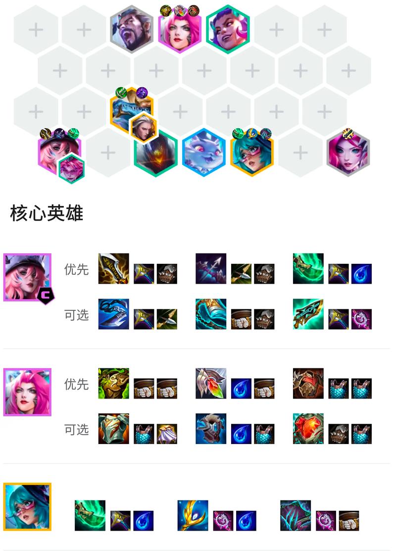 装备选取 主C天使:核心装备:羊刀(大棒+反曲弓)、法爆(大棒+拳套)。羊刀提供攻速加成,使天使的攻击频率更快;法爆则增加技能暴击伤害,提升输出能力。备选装备:科技枪(大剑+大棒)、帽子(大棒+大棒)。科技枪提供吸血效果,增强续航;帽子则进一步提升技能伤害。