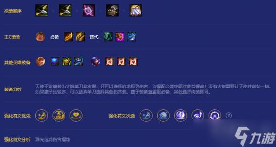 主C天使:装备选取羊刀、羊刀和巨杀。羊刀可以提供攻速加成,让天使的攻击速度越来越快,巨杀则可以对高血量敌人造成额外伤害。主T波比:救赎、坚定之心和板甲是波比的核心装备。救赎可以提供群体治疗效果,坚定之心增加坦度,板甲则提供额外的护甲。副C拉克丝:蓝buff、帽子和法爆是拉克丝的理想装备。