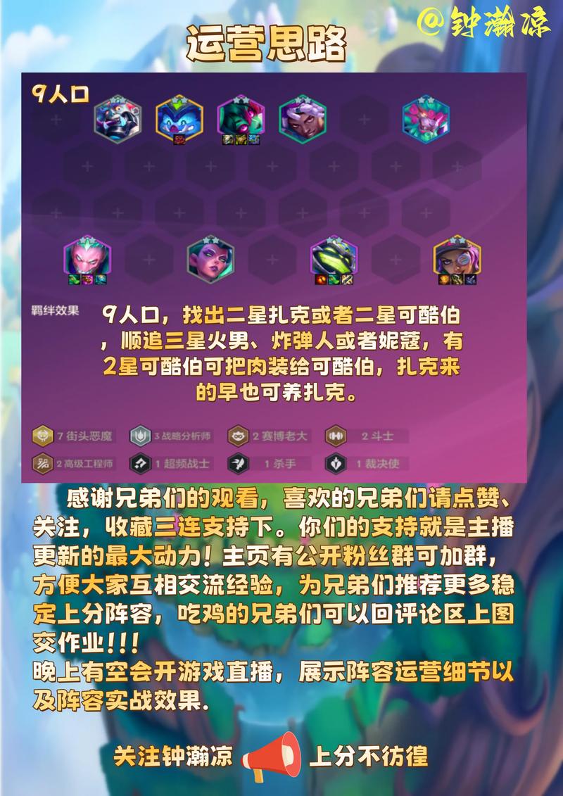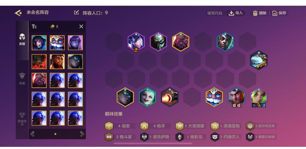 〖Three〗、核心英雄与羁绊 核心英雄:厄运小姐(女枪),作为阵容的主要输出点,需确保其装备充足,以提升清场能力。羁绊搭配:建议至少触发3黑魔法师羁绊(卡萨丁、莫甘娜、拉克丝),以提供额外的技能伤害加成。同时,可以考虑加入2射手或2冒险家羁绊,进一步增强整体战斗力。