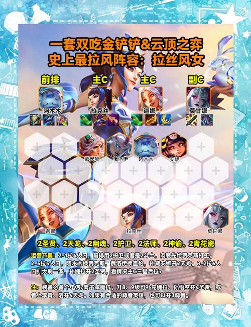 拉克丝:推荐装备无尽之刃(增加暴击伤害)、珠光护手(增加法术暴击)、朔极之矛(提供回蓝效果)。拉克丝作为控制和输出英雄,装备选取应偏向法术伤害和回蓝。羁绊搭配 耀光使羁绊:增加敌人的法术抗性削减效果,增强莫甘娜和拉克丝等英雄的法术伤害。