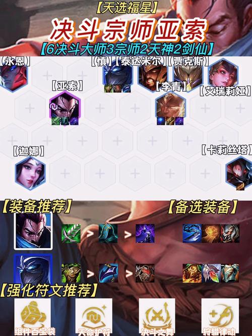 核心英雄选取 亚索:作为阵容的核心之一,亚索的大招可以击飞敌人,为队友创造良好的输出环境。阿狸:阿狸则通过其灵动的位移和多段攻击,在短时间内造成大量伤害,与亚索的技能形成完美配合。装备选取 亚索:推荐携带蓝霸符、青龙刀等增加法力值恢复速度的装备,以便更快地释放大招。
