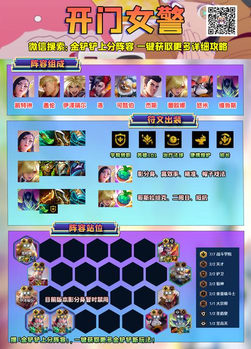 羁绊组成:7水晶玫瑰 + 2护卫 + 2主宰 + 1星守。核心棋子:寒冰(主C)、乌鸦(主坦)、布隆(副坦)。这个阵容以其强大的生存能力和爆发伤害,被誉为版本之子,非常适合用来上分。至高天九五阵容(后期无敌)羁绊组成:6至高天 + 2决斗 + 2狙神。