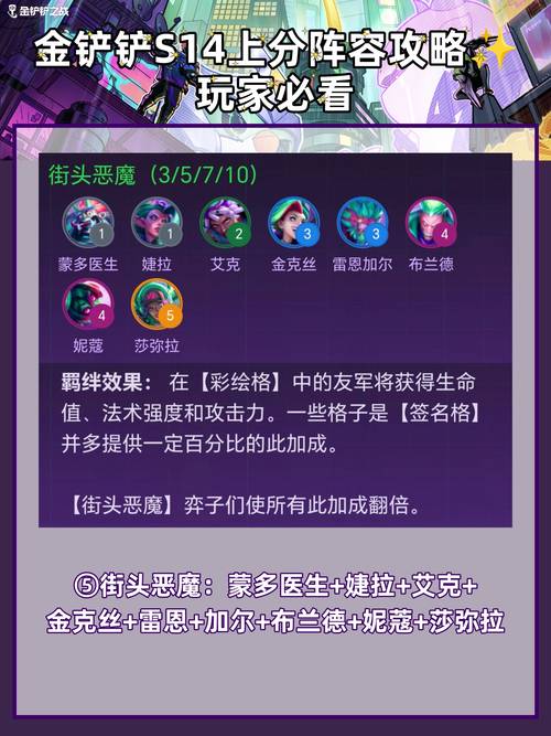 《金铲铲之战》S14机甲人造人阵容攻略:阵容构筑 核心英雄:烬、伊莉丝(蜘蛛)、希瓦娜(龙女)推荐阵容:千珏、奈德丽(豹女)、希瓦娜、伊莉丝、厄运小姐(女枪)、烬、阿萝拉/莫甘娜、瑟庄妮/贾克斯、鳄鱼+贾克斯/铁男+可酷伯。其中,如果没有瑟庄妮,可以选取2星的贾克斯替代。