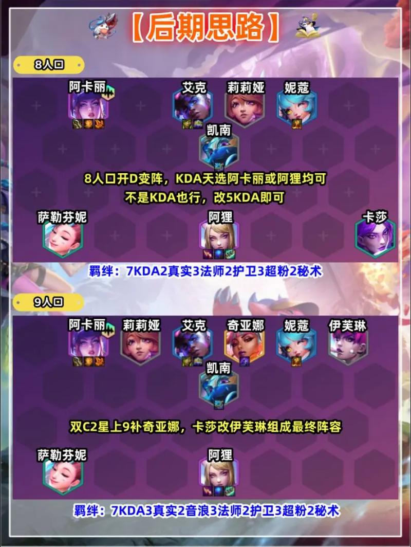 〖Two〗、阵容构成 核心羁绊:7KDA、3法师、3超级粉丝。升级节奏 21升4人口,25升5人口,32升6人口,41或42升7人口。尽量使用利息升级,7级、8级替换低费打工卡,向以45费棋子为核心阵容转型。符文选取 理想主义对双正义的阿卡丽提升大。 治疗法球保证前排坦度。