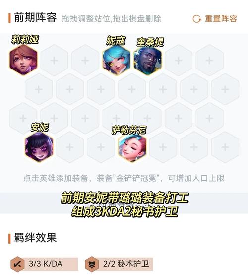 首选装备:鸟盾。鸟盾能为周围友军提供护盾,增强团队的生存能力,是尼菈在多数阵容中的首选装备。阵容过渡与运营 开局抢装:优先抢拳套或法爆,根据装备情况决定走连胜还是连败路线。3-2拉6人口:小D一波找2星亚索,搭配3超英4决斗羁绊即可锁血,随后卡50利息慢D三星亚索。
