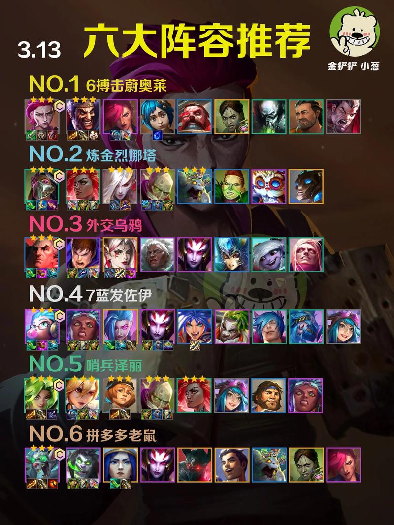 〖Five〗、第一套阵容:赫卡里姆+阿卡丽+慎+莫德凯撒+塔姆+尼菈+艾希 特点:以魔战士和魔神使者为主体,前期可以使用阿卡丽和慎进行过渡,非常方便。第二套阵容:杰斯+佐伊+加里奥+兰博+崔丝塔娜+巴德+妮蔻 特点:没有4费卡,适合速7的玩家使用。