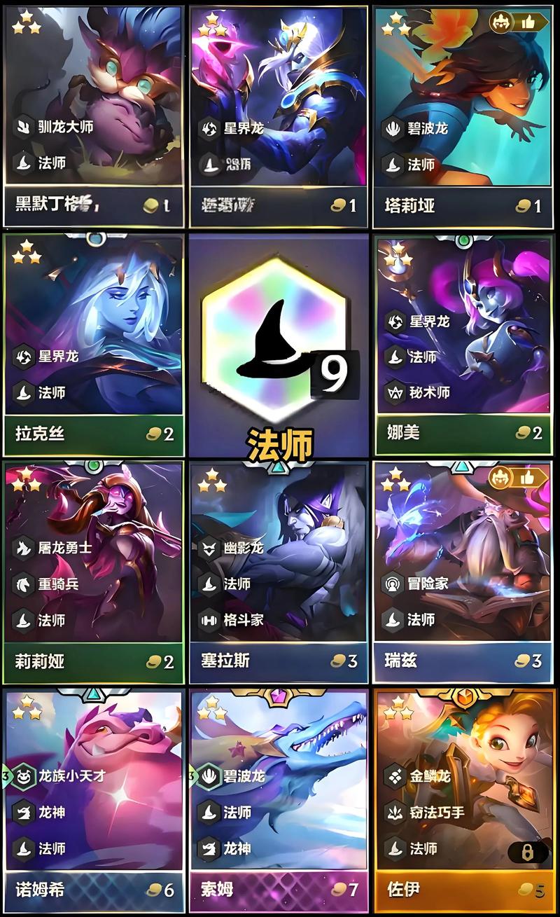 〖Three〗、提供专属的随机金鳞龙装备,装备强度受益于金币存款,数量随羁绊层级提升。幻镜龙(2/4/6/8):每场对局获得不同的羁绊加成,如雷霆、猛将、海盗等。驯龙大师(2/3):每回合投喂小点心给诺姆希,增加生命值和法术强度。诺姆希升星需要小点心,3驯龙大师时诺姆希造成额外伤害。