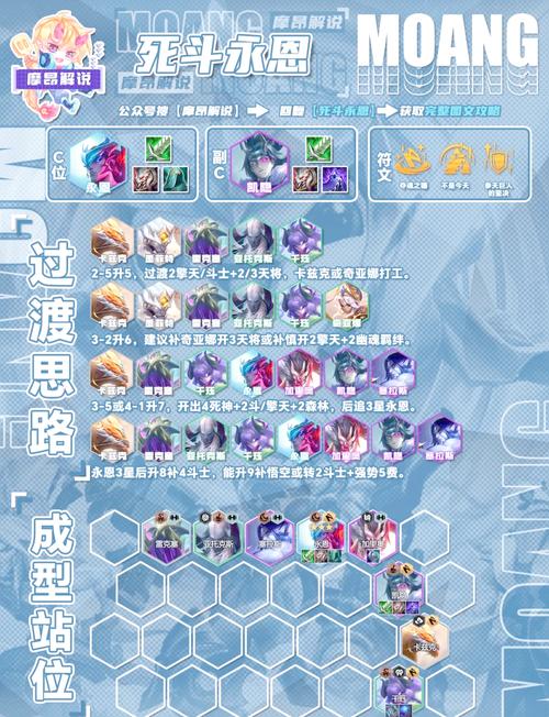推荐选取+1/2黑魔法师、黑魔法师转职、白魔法师转职、+1/2白魔法师和符能护盾等,以增强阵容的羁绊效果和整体战斗力。运营攻略 前期以锁子甲或腰带开局,优先做出薇古丝的肉装,利用3约德尔羁绊白嫖3星薇古丝。2-1拉4人口,2-5自动拉5人口,提前拉5人口以白嫖3费卡的薇古丝和马尔扎哈。