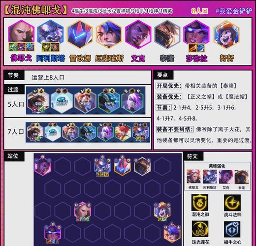 阿狸:纳什之牙、蓝buff、科技枪,提升输出和续航能力。艾克/妮蔻:狂徒、龙牙、反甲,提升前排坦度和抗性。过渡思路 前期:3-1或3-2阶段拉6人口,补充羁绊不D牌,利用低费卡打工。中期:遇到赛娜、巴德等二费赛季之星时,替换掉打工的1费赛季之星。3-5或3-7阶段拉7人口,继续补充羁绊不D牌。