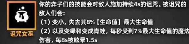 羁绊效果:3个法师时,所有友军获得35点魔法伤害;6个法师时,所有友军获得100点魔法伤害。1 恶魔:羁绊效果:恶魔的攻击有几率灼烧敌人的法力值并造成等额的真实伤害,几率随恶魔数量增加而增加。1 龙:羁绊效果:龙免疫魔法伤害。
