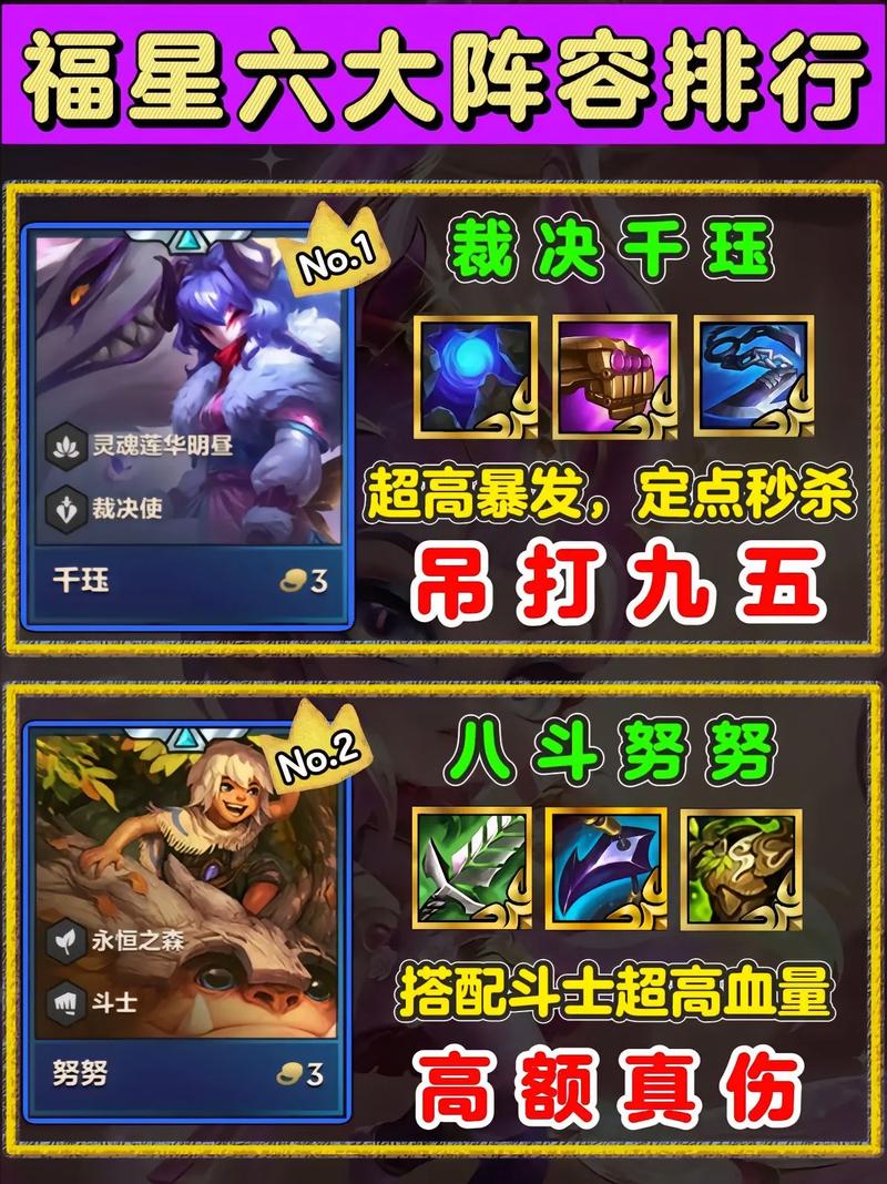 〖Three〗、装备推荐 开局首选装备为反曲弓,用于合成羊刀与分裂弓,这两件装备对阵容核心逆鳞战姬至关重要。装备优先级:攻速 大棒 暴击。攻速是此阵容的核心需求。阵容推荐 阵容组成:西斗之飒、蛛后、未来守护者、逆鳞战姬、凤黯、南天之怒、齐天大圣、星界龙神、狻猊之心(9人口成型)。