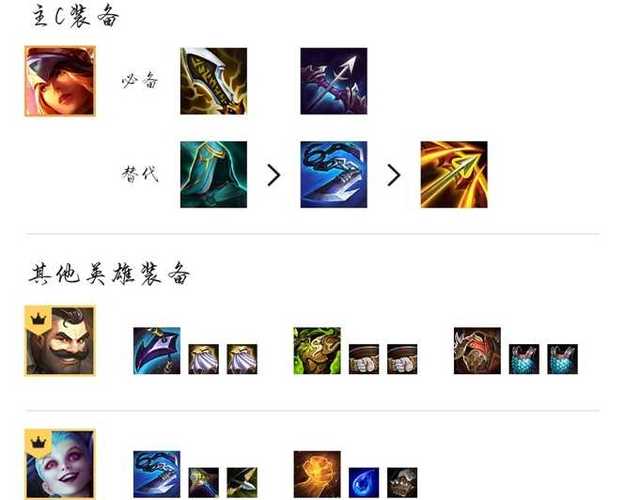 露露:救赎(必备,至少两件),第三件可以选取兰盾或其他防御装。莫甘娜:板甲、水银为核心,多余救赎也可拿,或选取泰坦、反甲、狂徒等防御装。狐狸:科技枪、大天使之杖,大天使之杖的收益高于帽子,是狐狸的核心输出装。