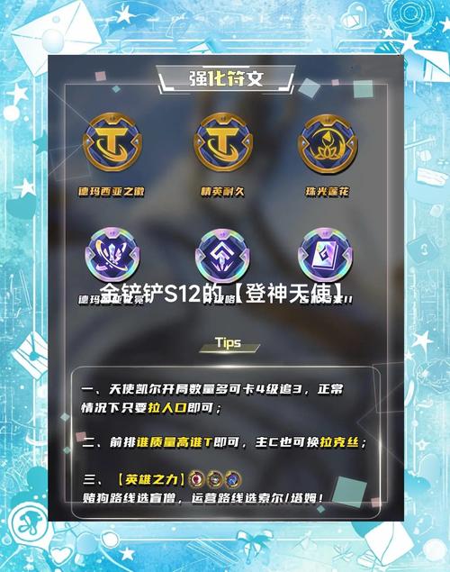 金铲铲之战S9登神天使阵容搭配及装备羁绊选取 阵容搭配:核心英雄:凯尔(天使)作为主C,波比作为主T,拉克丝作为副C。其他英雄:茂凯、皇子等,用于凑齐德玛西亚羁绊。在9级时,若无德玛西亚转职,可补阿狸、大头等英雄,以增强整体实力。装备搭配:主C天使:推荐装备为两把羊刀和巨杀。