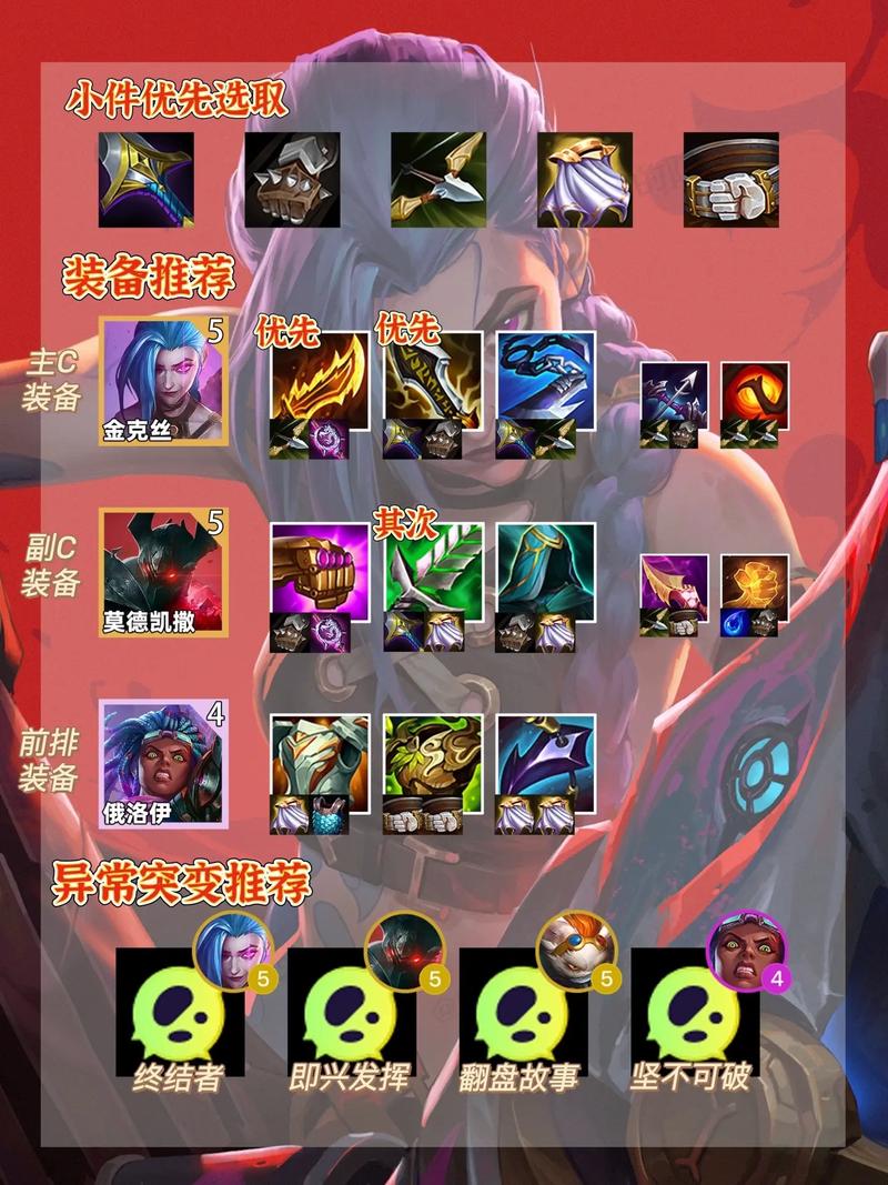〖Five〗、金铲铲之战s6欺诈魔女第二关怎么过【装备分配】合成反甲、救赎、羊刀、巨杀、破甲弓;反甲和救赎给到蔚,其他装备全部给到金克丝,提升生存能力和输出。
