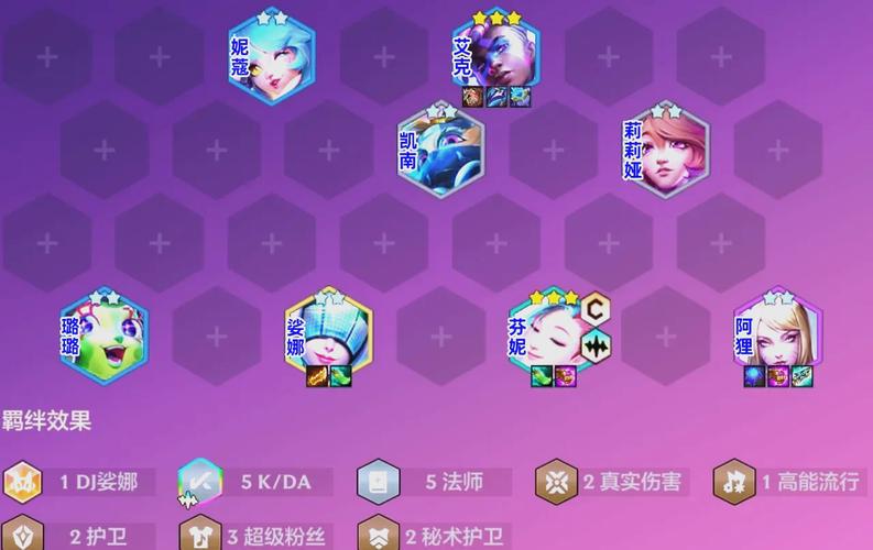 《金铲铲之战》KDA阵容推荐:阵容介绍 核心羁绊:7KDA、3法师、3超级粉丝、2护卫、2秘术。天选阿卡丽或阿狸的KDA天选为最佳,其他天选则根据羁绊调整。关键英雄:低费卡安妮和萨勒芬妮可作为前期过渡,高费卡阿卡丽和阿狸是阵容核心。