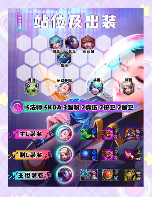 阵容组成 萨勒芬妮为核心的阵容主要由以下英雄组成:萨勒芬妮、艾克、悠米、阿狸、辛德拉、猫咪(索拉卡)、凯南、露露。这套阵容兼具输出与控制,能够应对多种战斗环境。阵容羁绊 5法师:提供强大的法术输出能力。3KDA:为KDA英雄提供额外属性加成。2爱心使者:增加全体友军的法术强度。