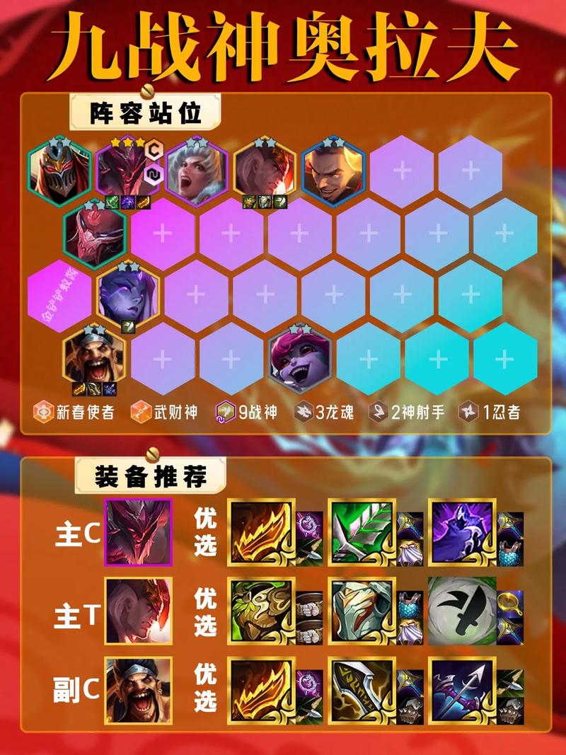 阵容羁绊:主要羁绊:6战神(提供高额的攻击力和攻击速度加成,以及生命偷取效果),搭配其他如3永恒之森、2重装战士等辅助羁绊。九五转变:在9人口时,尽量上5费卡以提升阵容的整体强度,如瑟提、凯隐等强势单卡。