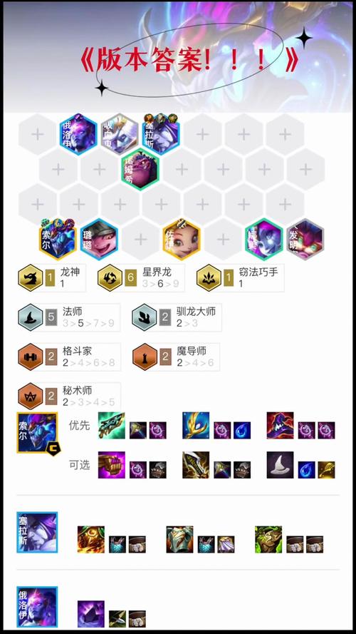 幽影斗赛芬:以赛芬为龙神核心,搭配6幽影龙和4格斗家羁绊,拥有高额的爆发伤害和坦度。屠龙刺客奥拉夫:以奥拉夫为刺客核心,结合屠龙勇士和刺客羁绊,提供高额的单体爆发能力。金鳞龙阵容 怒翼瑟提:以瑟提为龙神核心,搭配9怒翼龙和2换形师羁绊,拥有极高的持续输出能力。