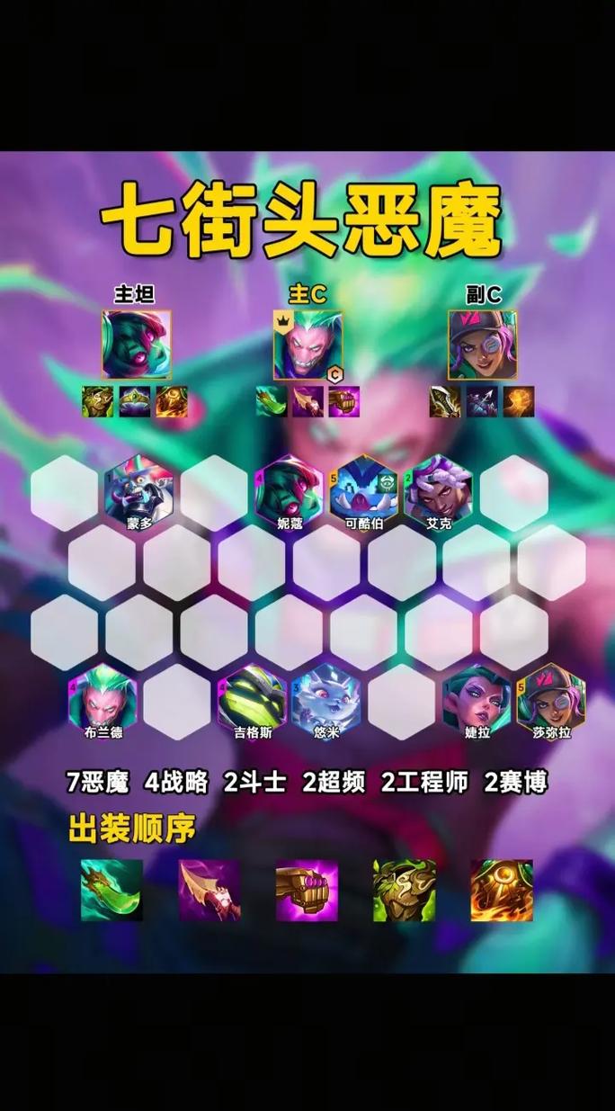 〖Five〗、金铲铲之战s14七街头恶魔阵容的搭配方案如下:阵容核心棋子 安妮:作为阵容的主要输出点,安妮的技能可以召唤提伯斯,对敌人造成范围魔法伤害并眩晕。在街头恶魔羁绊的加持下,其伤害能力更为可观。小丑:小丑的分身机制使其能在战场上迅速打出高额伤害,是阵容中不可或缺的输出棋子。
