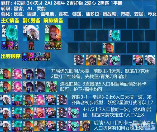 〖Four〗、阵容组成 核心英雄包括塔莉娅、辛德拉或努努、安妮。 其他辅助英雄可根据羁绊需求选取,如拉克丝、芮尔、悠米、阿利斯塔等。阵容站位 站位需根据敌方阵容和黑客切入情况进行调整。 一般来说,塔莉娅应置于后排安全位置,确保输出。 安妮等前排坦克应置于前排,吸收伤害。