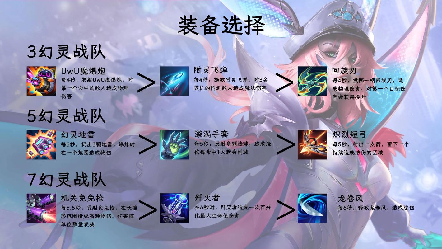 UwU魔爆炮:功能:每5秒随机选取一个【幻灵战队】棋子发射炮弹。伤害类型:对第一个被命中的敌人造成物理伤害。炽烈短弓:功能:每6秒随机选取一个【幻灵战队】棋子发射箭矢。伤害类型:箭矢穿过后形成一个持续造成魔法伤害的区域。附灵飞弹:功能:每5秒随机选取一个【幻灵战队】棋子扔出飞弹。