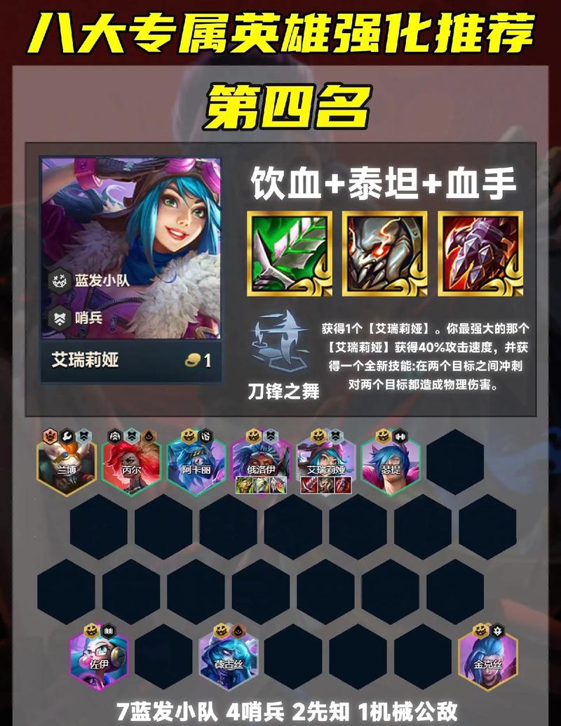 阵容组成:雷克赛、蔚、塔姆、瑟庄妮、嘉文四世、刀妹、希维尔、卢锡安。羁绊组成:4海克斯:战斗环节开始时和之后的每6秒,发射脉冲为友方海克斯科技弈子提供护盾,并附带额外魔法伤害。4格斗家:队伍获得最大生命值加成,格斗家们获得双倍加成。4强袭战士:强袭战士们获得额外攻击力。