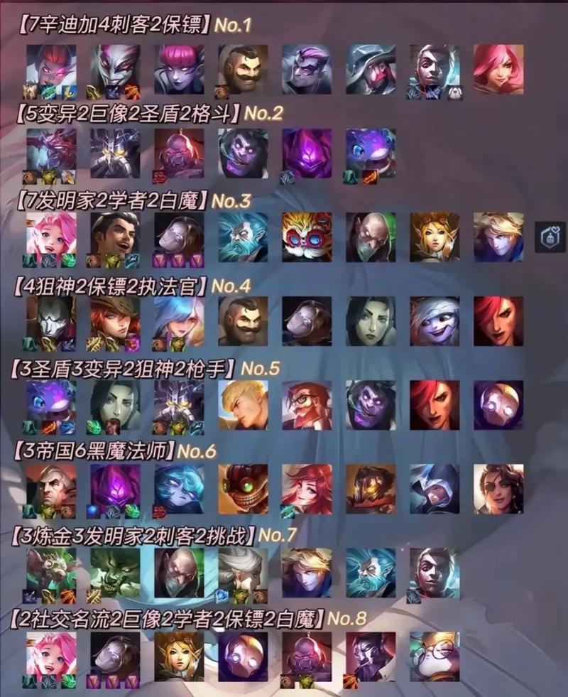 阵容组成:核心英雄:布里茨、布隆、丽桑卓、悠米、厄运小姐、奥丽安娜、塔里克、迦娜、烬。羁绊搭配:2保镖、2学者、3白魔法师、2狙神、2精密发条、2极客、1社交名流、1猫猫。核心打法:前排坦度与回复:保镖与白魔法师羁绊提供前排坦度和可观的回复效果,为厄运小姐与烬创造良好的输出环境。